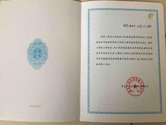 该证书由黑龙江省住房和城乡建设厅印制,延寿县住房和城乡建设局颁发,经建设单位、勘察单位、设计单位、施工单位、监理单位、施工图审查机构及检测单位逐级审查审核,最终以完整的手续办理该备案证书。