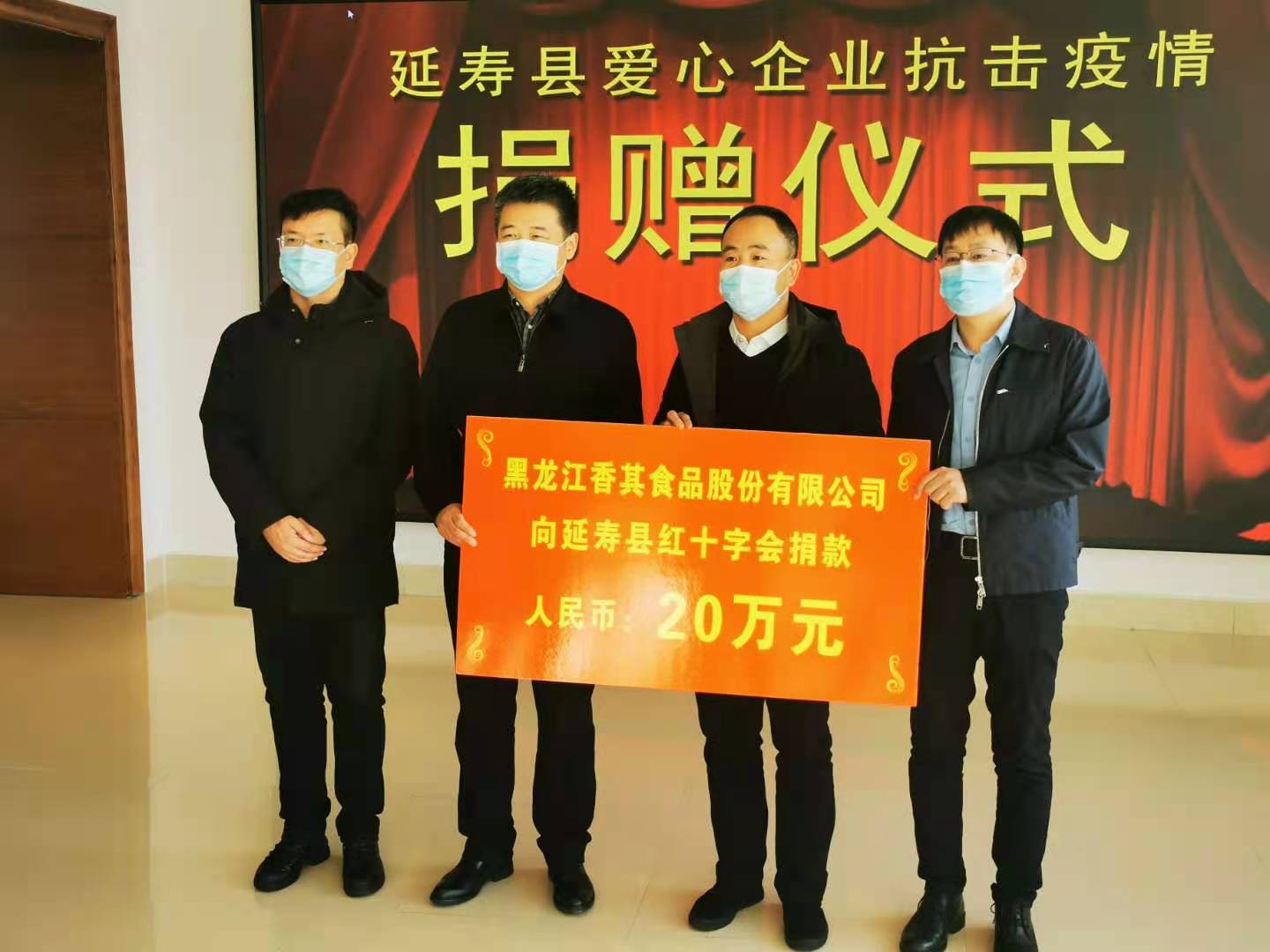 2021年2月4日上午,股份公司通过延寿红十字会向延寿县疫情防控部门捐赠资金20万元,延寿县委副书记、县长张洪岐、副县长张仁洪、苏应来及股份公司总经理孔德柱在延寿县经济技术开发区举行了捐赠仪式。