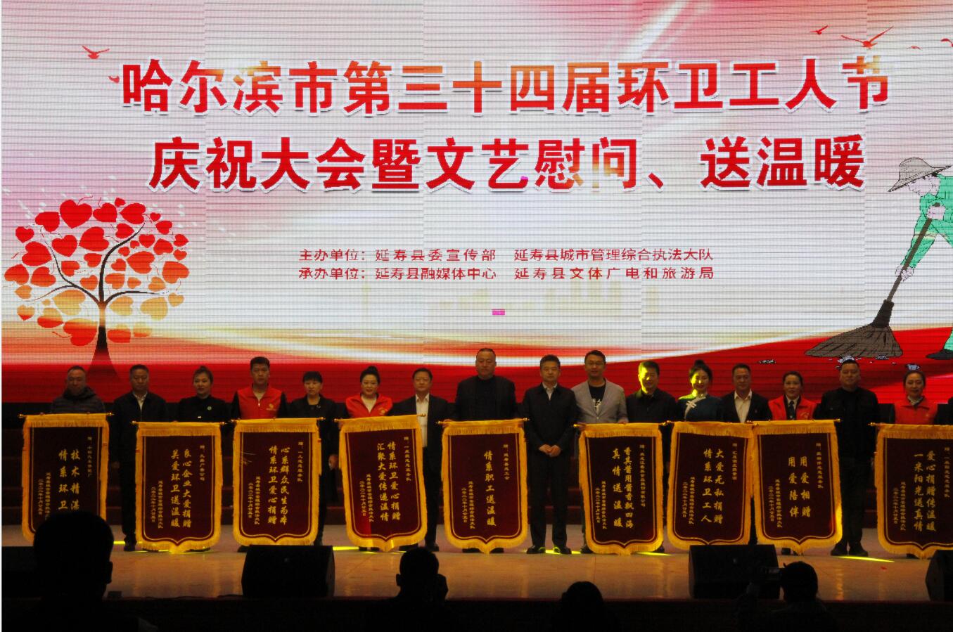 在庆祝大会暨文艺慰问演出送温暖活动上,延寿县城市管理综合执法大队将一面印有“华体会hth酱用酱香飘四海,真情送温暖”的锦旗送到华体会体育hth分公司经理高博手中,以此向华体会体育hth对环卫工人的关心与重视表示感谢!