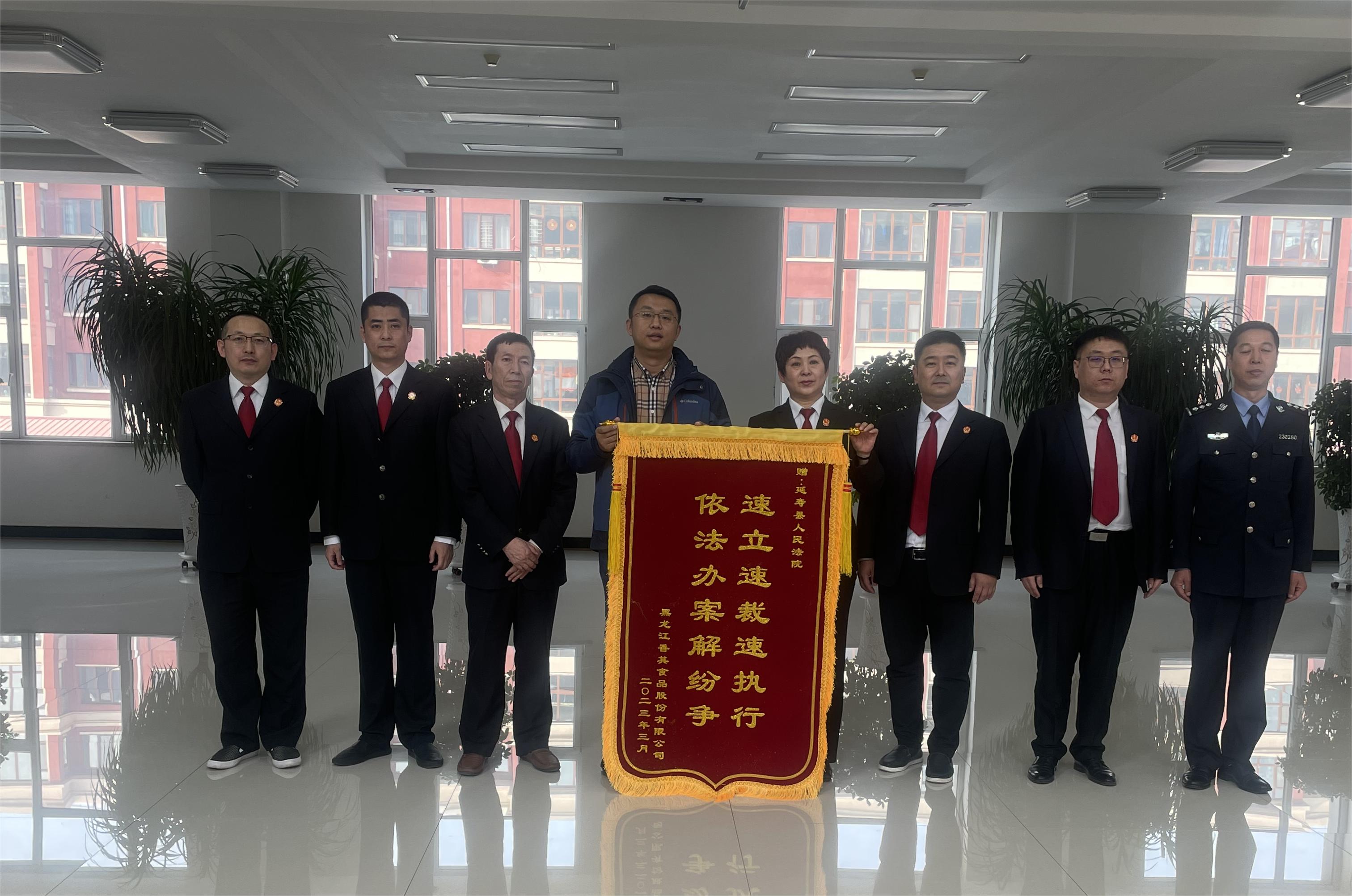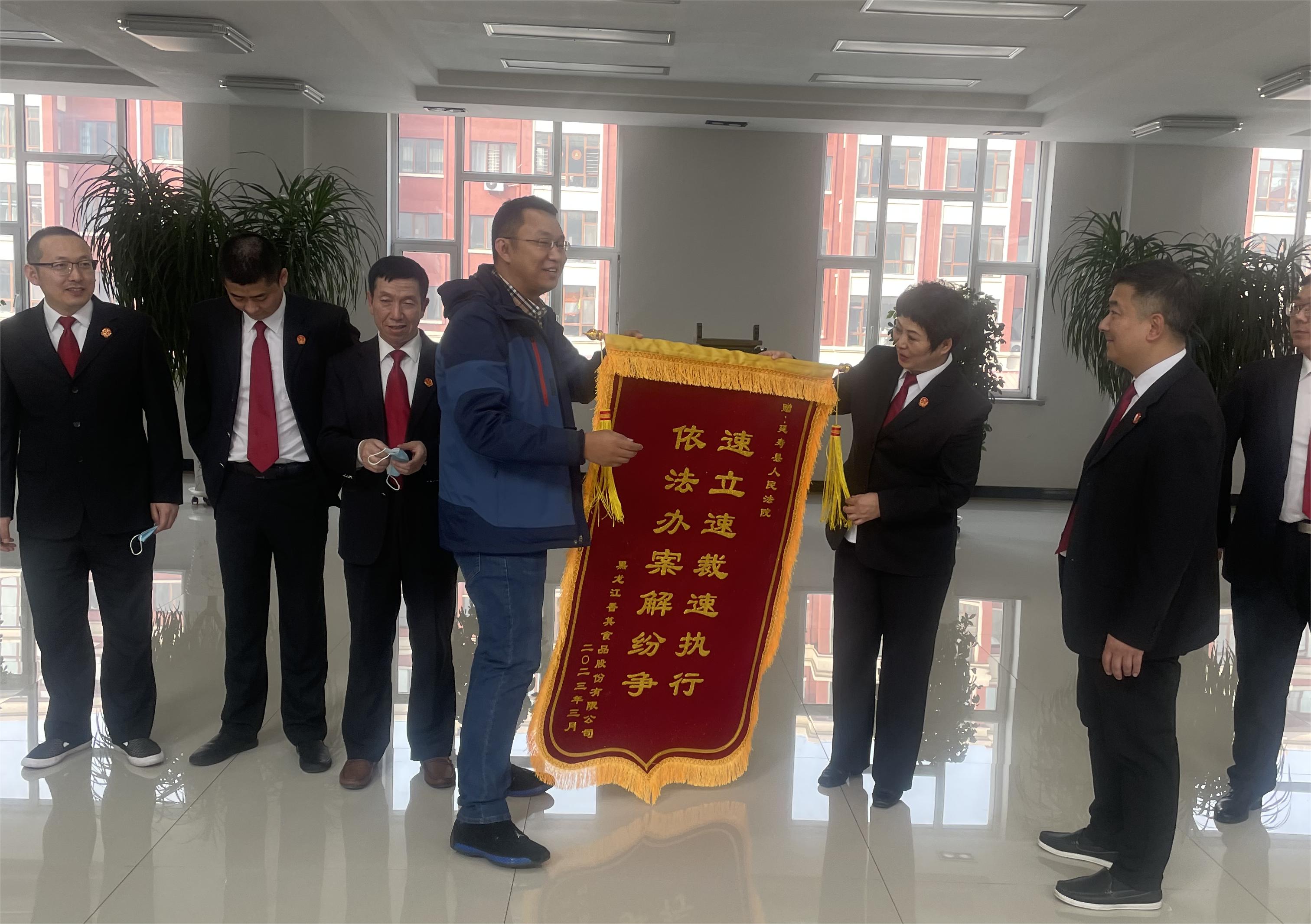 2023年3月6日,hth华体会体育APP官方网站为延寿县人民法院送上一面“速立速裁速执行,依法办案解纷争”的锦旗,对延寿县人民法院高效执行、维护企业合法利益做出的努力表示诚挚感谢和敬意。