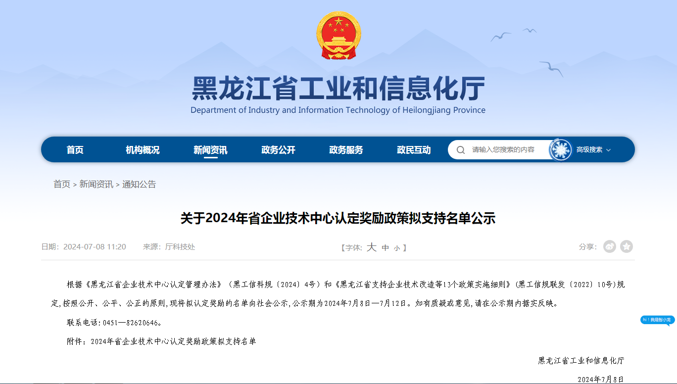 2024年7月8日黑龙江省工业和信息化厅官网公布2024年省企业技术中心认定的入围名单,hth华体会体育APP官方网站荣列其中,被认定为“省级企业技术中心”,这是继“市级企业技术中心”之后的又一突破。